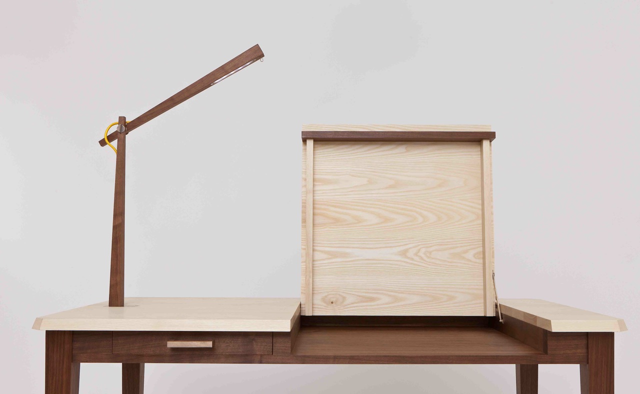 The table represents the growing demand for temporary office space outside of the home. For many, office blocks are a thing of the past and an increasing number of nomadic workers roam London in search of welcoming workspaces. Named 'Devil Amongst the Tailors', after a traditional table-top skittles pub game, the table boasts a luxurious surface in ash or maple for entertaining, a brass foot rest for putting your feet up and combines a series of specific functions. Lifting up the lid reveals a private work surface, boasting skittle shaped office organisers for storing pens & paperclips and a task light that fixes to the table’s numberplate. Want to stop for lunch, have a meeting with a client or simply go for a cigarette? Simply close and lock the lid. Work and its associated mess are banished, safely stored, out of site and out of mind. If it’s time to relax, place the removable drawer onto the table surface, arrange the skittle shaped office organisers &hook the brass ball and chain onto the light. An impromptu game of ’Devil amongst the Tailors’ can now be enjoyed. For Kevin Haley of aberrant architecture “This unique commission allowed us to further our research into contemporary lifestyles and flexible working conditions at the challenging scale of a table. Working closely with Wallpaper*, Benchmark and AHEC during both the design development & production stages produced a creative collaboration, which we believe resulted in a far richer process and an unexpected & exciting end product.”