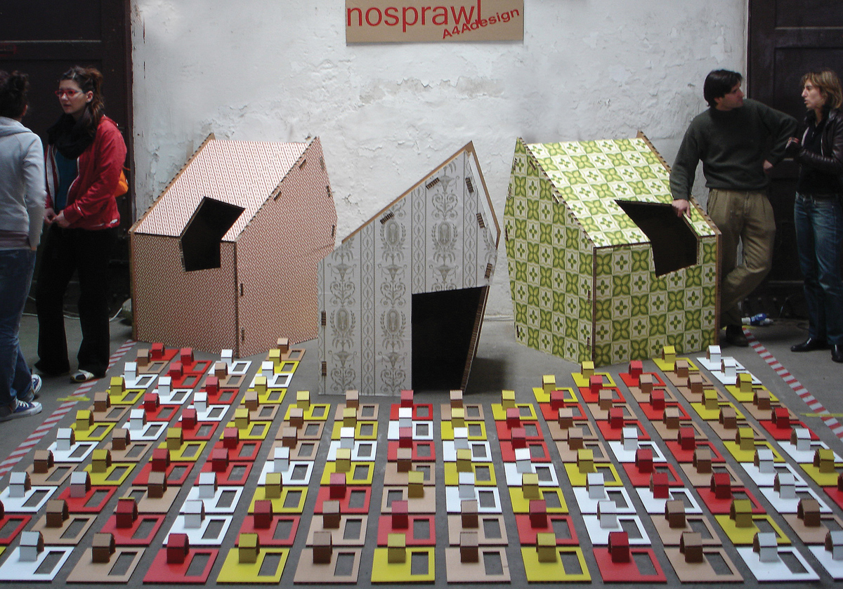 L’installazione No Sprawl (Milano, Vecchi magazzini della Stazione di Porta Genova, 2006) è servita per lanciare un messaggio di critica al cosiddetto fenomeno dello sprawling, cioè dell'espansione urbana contemporanea, agerarchica e priva di pianificazione. L’allestimento ha materializzato questa occupazione indifferenziata del territorio invadendo lo spazio con la ripetizione seriale di decine di casette schematiche in cartone, complete del loro piccolo giardino di pertinenza. Sempre sul fronte della costruzione e della collocazione di elementi qualificanti, utilizzati per comunicare un’idea o per suggerire e incentivare un comportamento, il progetto Nati per Leggere (Torino, Salone Internazionale del Libro, 2010) ha prodotto una serie di arredi ecologici e giocosi, per supportare e ambientare le attività di lettura ad alta voce dei bambini in età prescolare.