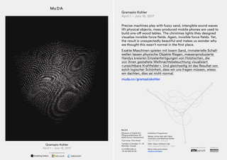 Precise Machines play with fuzzy sand, intangible sound waves lift physical objects, mass-produced mobile phones are used to build one-off wood tables. The christmas lights they designed visualise invisible force fields. Again, invisible force fields. Yet, the result is unexpectedly beautiful and makes us wonder why we thought this wasn't normal in the first place.