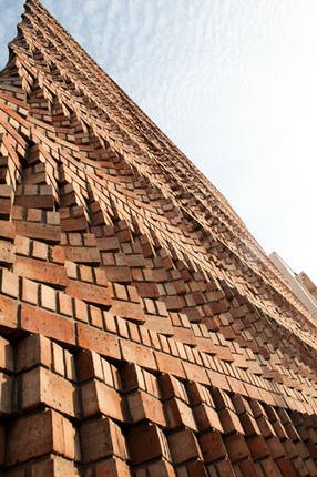Design e la creatività applicata hanno trasformato il nuovo edificio sede del Centro di Documentazione per i diritti umani dell'Asia del Sud Documentazioni (SAHRDC) a Delhi in una struttura originalmente poetica. Su uno spazio di appena 50 mq e con un budget limitato, il duo architettonico di Valbhav Dimri e Madhav Raman, ha creato un funzionale ed economicamente efficiente spazio per uffici. Nell’elaborazione dell’idea, importanza fondamentale è stata posta nel riparare le aree di lavoro dal rumore e dalle distrazioni visive della strada e dall’irradiazione solare diretta. Ciò è stato ottenuto applicando sulla parete esterna di quella che altrimenti sarebbe stata una facciata estremamente minimalista un elaborato muro di mattoni accanto alla parete più lunga dell’edificio. Ispirandosi alle costruzioni tradizionali, è stato configurato un modulo di mattoni che si ripete, uguale a sé stesso, creando una forma complessa. Il modulo è stato creato sullo stile di un jalis (brise soleil) splendidamente scolpito, assecondando una lunga tradizione presente nell’architettura indiana. Mattoni faccia a vista, misura 230 x 115 x 75 mm (il formato standard di mattoni in India), sono stati utilizzati per raggiungere questo obiettivo. La costruzione dell’elaborato muro frontale è il risultato di cinque settimane di processo di apprendimento e ri-apprendimento, accompagnato da esperimenti in situ. La forma ondulata del muro è un buon esempio di come effetti architettonici particolarmente elaborati possono essere raggiunti quando la forma semplice del mattone apre la strada, grazie alle sue caratteristiche uniche, all’elaborazione formale di modelli complessi di strutture e aperture.