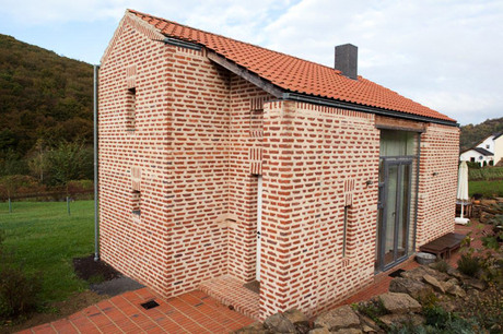 L’arcaica semplicità della loggia nascosta realizzata da Nikolaus Bienefeld è incantevole. Grazie all’impiego di metodi costruttivi attenti all’impatto ambientale, la discreta ed efficiente organizzazione degli spazi rende questa costruzione di 62 mq un piccolo capolavoro. L’architetto in persona si è preso cura di tutti i minimi dettagli. La cortina in mattoni crea una sensazione di robustezza, allo stesso tempo tradizionale ma curata, che testimonia l’ingegnosità con la quale è stata ideata e realizzata. Il risultato è stato ottenuto utilizzando un mattone di basso costo – fatto questo che ha richiesto un più alto livello di impegno ed esperienza da parte dell’impresa dei posatori. Architravi delle finestre e porte, e frontoni, portano una piacevole varietà agli strati regolari di mattoni ed i dettagli rivelano una libertà affascinante di realizzazione nell’uso del laterizio come principale materiale da costruzione. I dettagli artistici della facciata, così come della cassetta della posta e del campanello, mostrano quanta attenzione e cura possa essere riposta nella realizzazione finale di una abitazione.